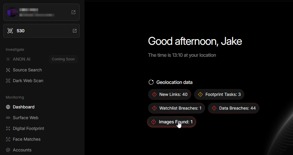Screenshot of the Become Anon Service – this service monitors for presence of my email address, usernames, and first / lastname across the internet (It automates open-source intelligence)